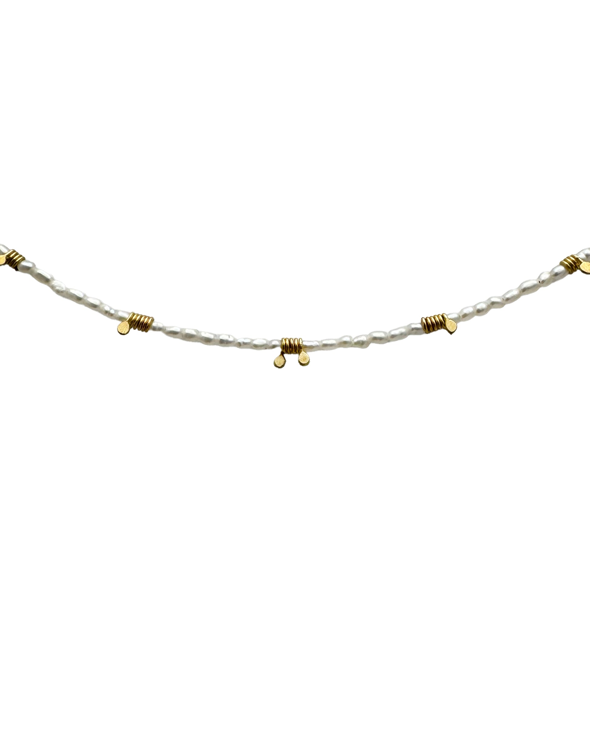This delicate white freshwater seed pearl necklace combines the purity of pearls with the artistry of hand-coiled 18kt yellow gold spirals, creating a piece that radiates timeless elegance. The minimalist design highlights the textural contrast between the lustrous pearls and the intricate, hand wound gold coils, showcasing exceptional craftsmanship. Versatile and refined, this necklace can be worn alone for a subtle statement or layered for a more dynamic look. Perfect for any occasion, it offers a harmonious blend of sophistication and artisanal detail that elevates everyday style.
